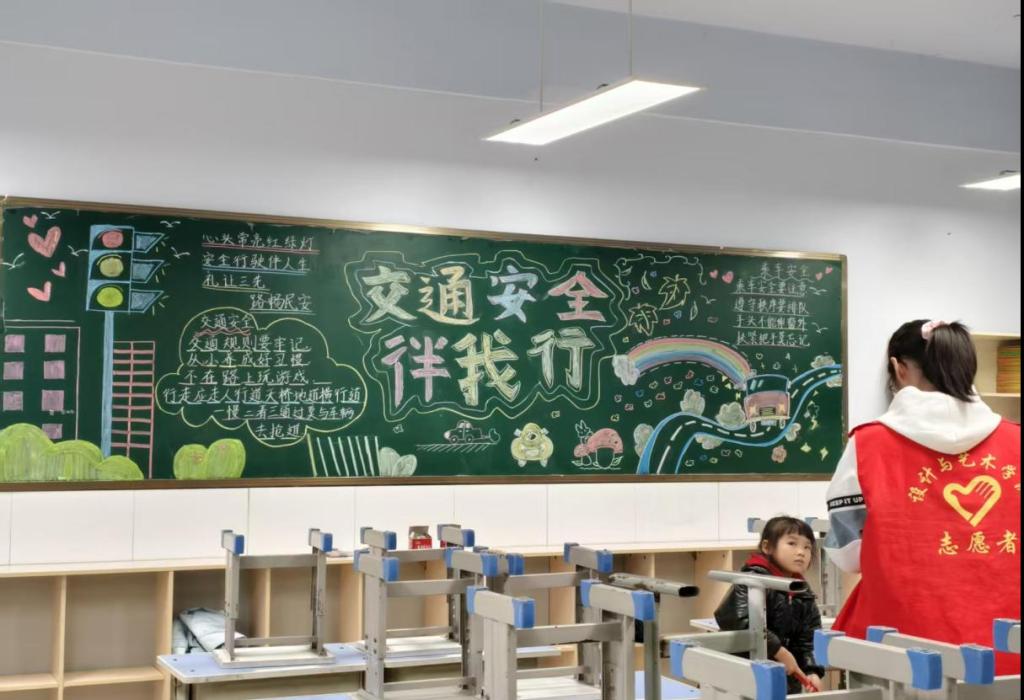 活动现场,设计与艺术学院的志愿者们充分发挥专业特长,将艺术设计知识与交通安全宣传巧妙融合。志愿者们抵达弘德小学一年级五班,精心筹备,以饱满的热情投入到黑板报创作中。他们以“交通安全伴我行”为主题,用缤纷的色彩、生动的图案,将交通信号灯、安全出行规范等元素融入板报,既展现了艺术的美感,又传递了交通安全的重要性。在创作过程中,在板报上写下交通安全规则和乘车安全规则。在孩子们心中种下了安全出行的种子。此项目不仅为弘德小学的校园文化增添了一抹亮色,也成为设计与艺术学院学生践行志愿服务、展现专业素养的生动实践。