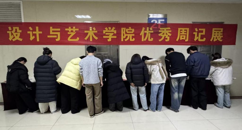 本次周记展面向全院学生征集优秀周记,聚焦一二·九运动的历史脉络、时代价值与青年担当。经过层层筛选,兼具思想性与感染力的优秀周记脱颖而出,生动展现了设计与艺术学院学子铭记历史、砥砺前行的精神追求。同学们紧扣主题,将对历史的敬畏、对先辈的追思与对时代的思考融入字里行间。展览现场,一本本周记作品有序陈列,吸引师生纷纷驻足品读。